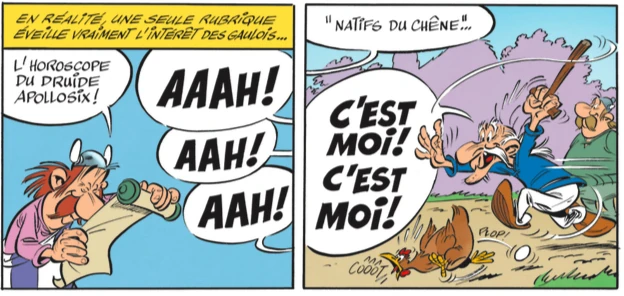 Pneumatix le facteur ammène chaque semaine le journal au village Gaulois et leur lis la rubrique de l'horoscope, il n'y a que cela qui les intéressent.